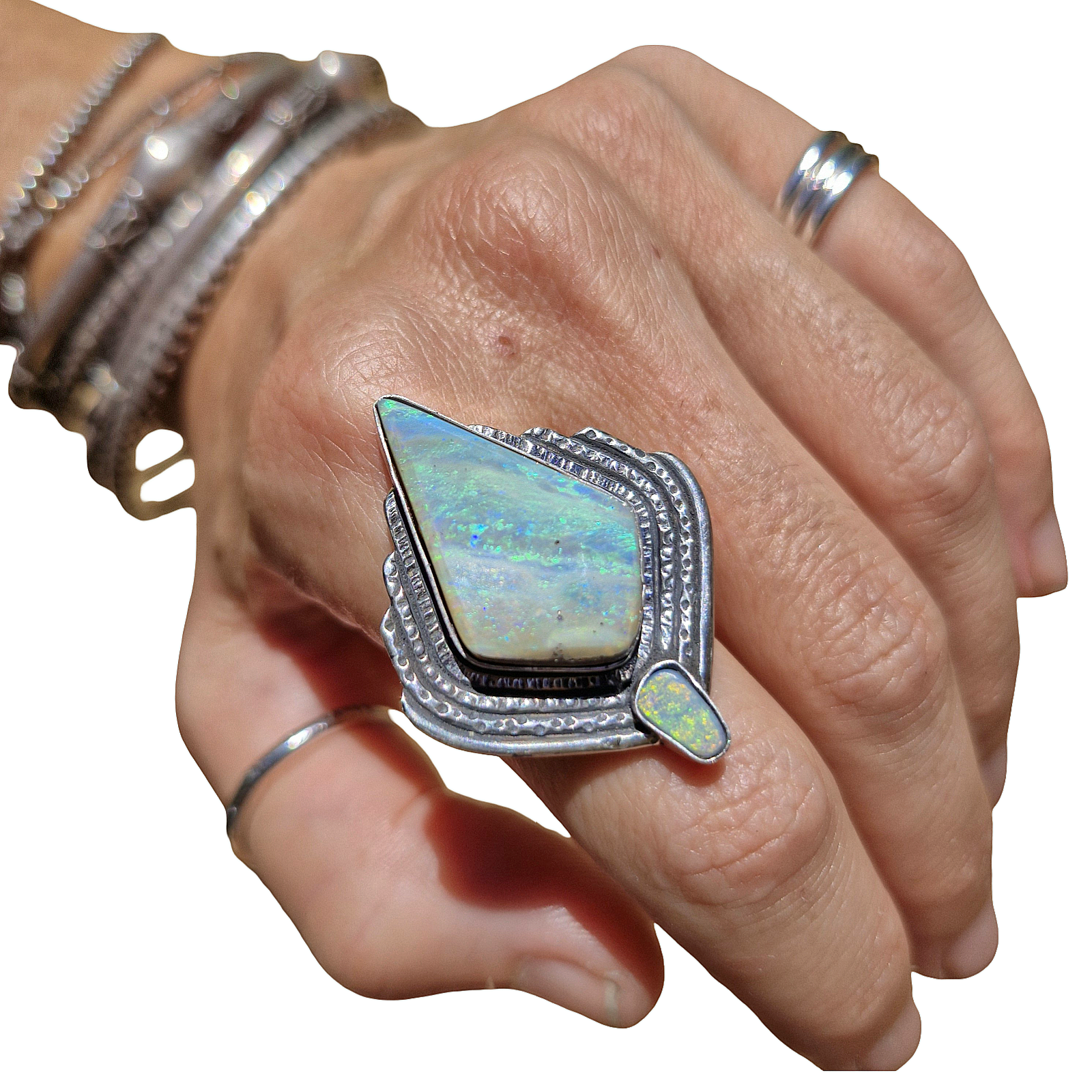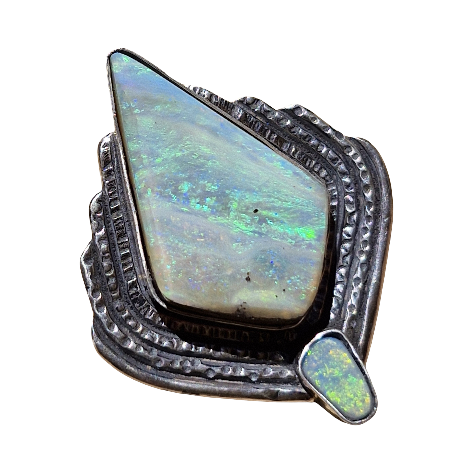 Super sparkly Boulder Opal with matching mini me Mintabie Opal with just as much rainbow flash... flash. Finished with multi hand textured borders.