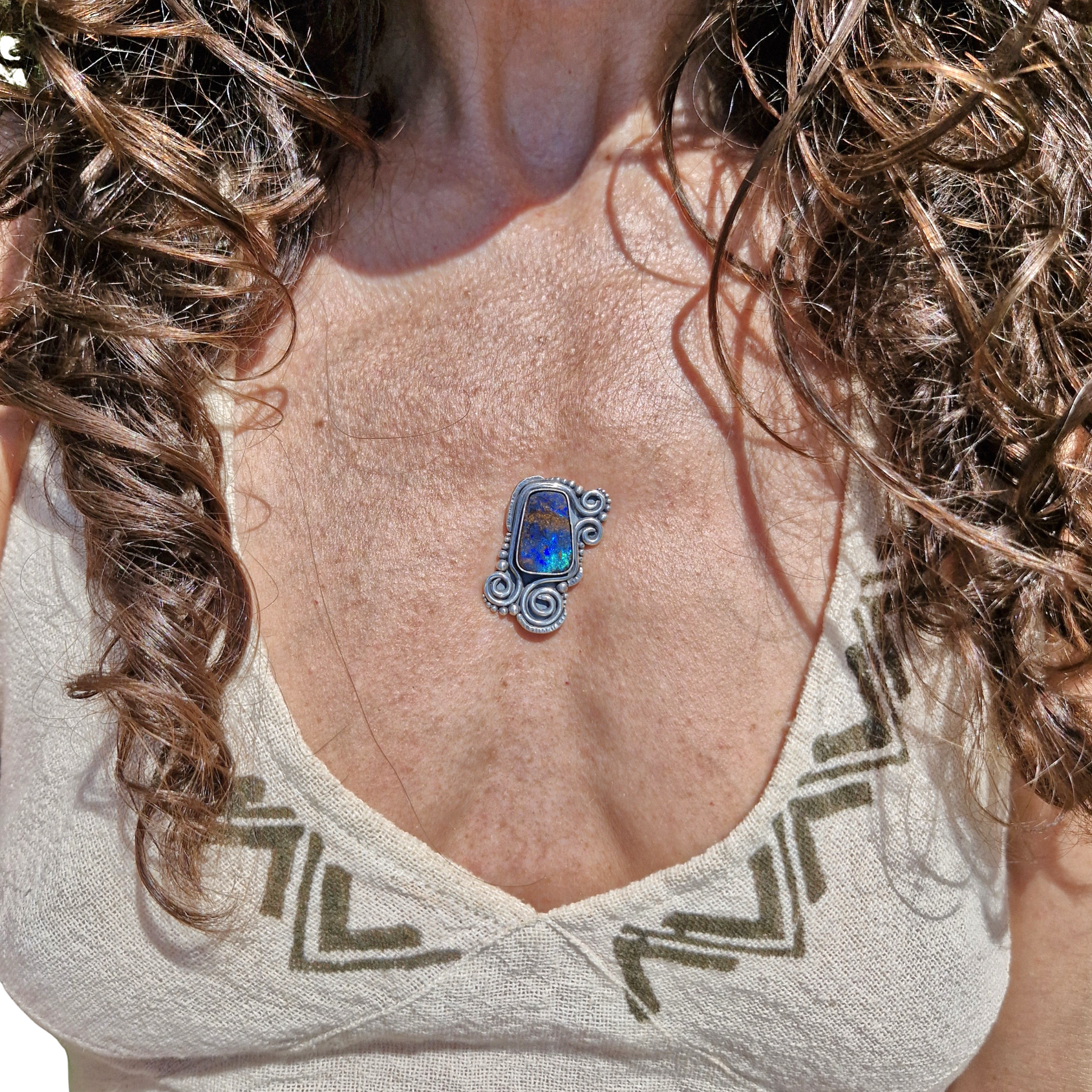 Stunning Boulder Opal with the most electric deep dark and turquoise blues.  So eye catching.  My spiral designs have kept evolving with this collection and this one is my favourite. Losts of swirls borders and dots and it reminds me a magical deep ocean creature.