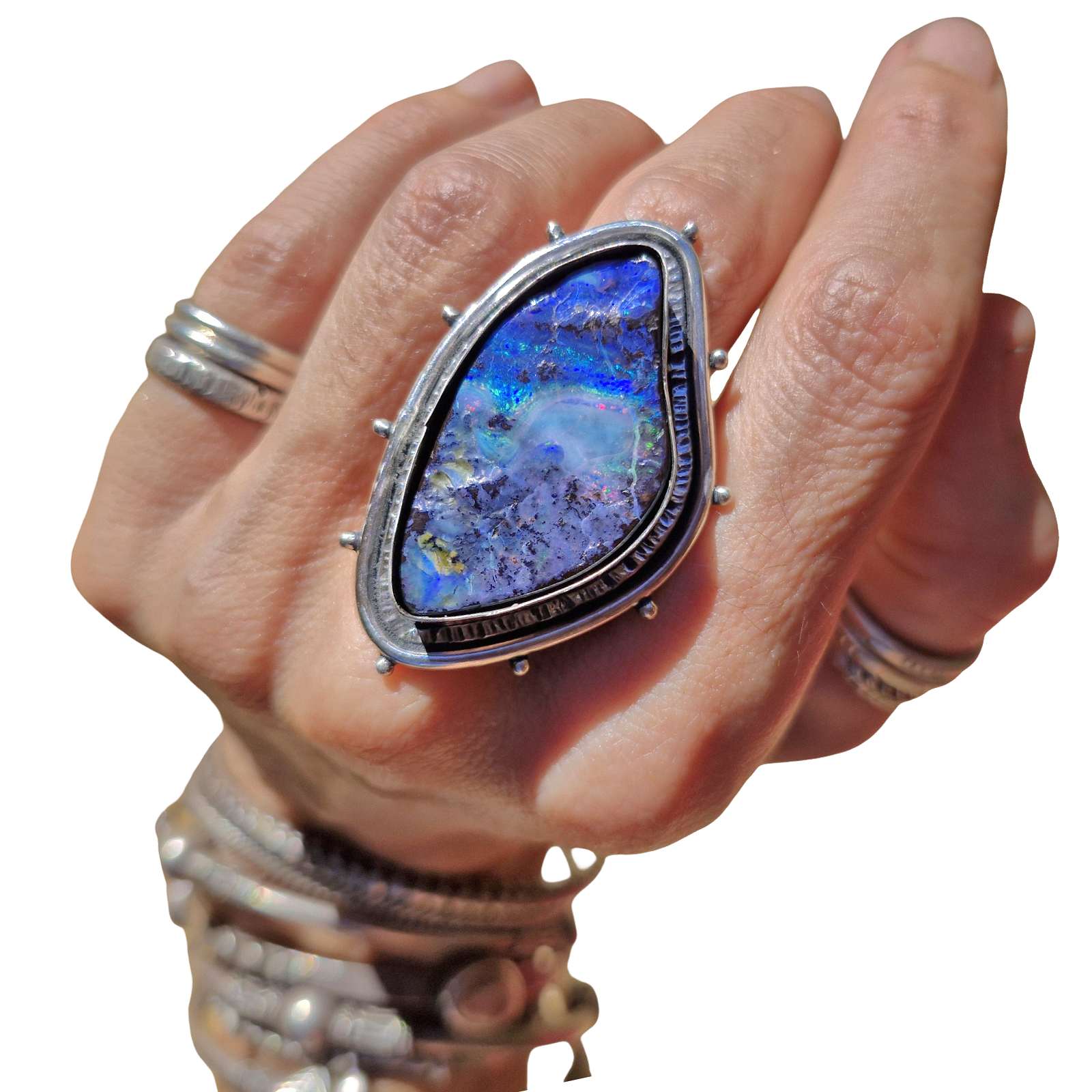 Insane huge Boulder Opal, something about this one just feels like strength. And such gorgeous deep rich indigo blues with streaks of greens and red rainbow flashes. Setting with smooth and hand textured borders and dots.