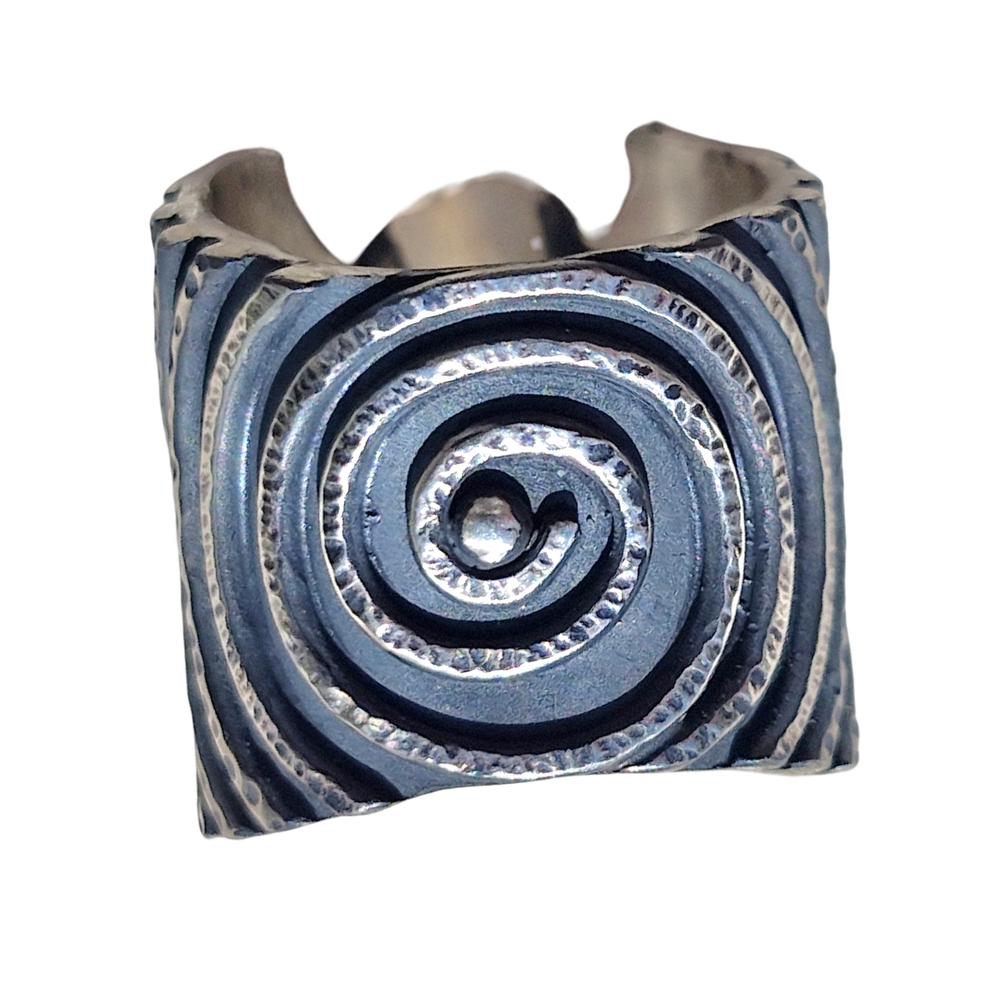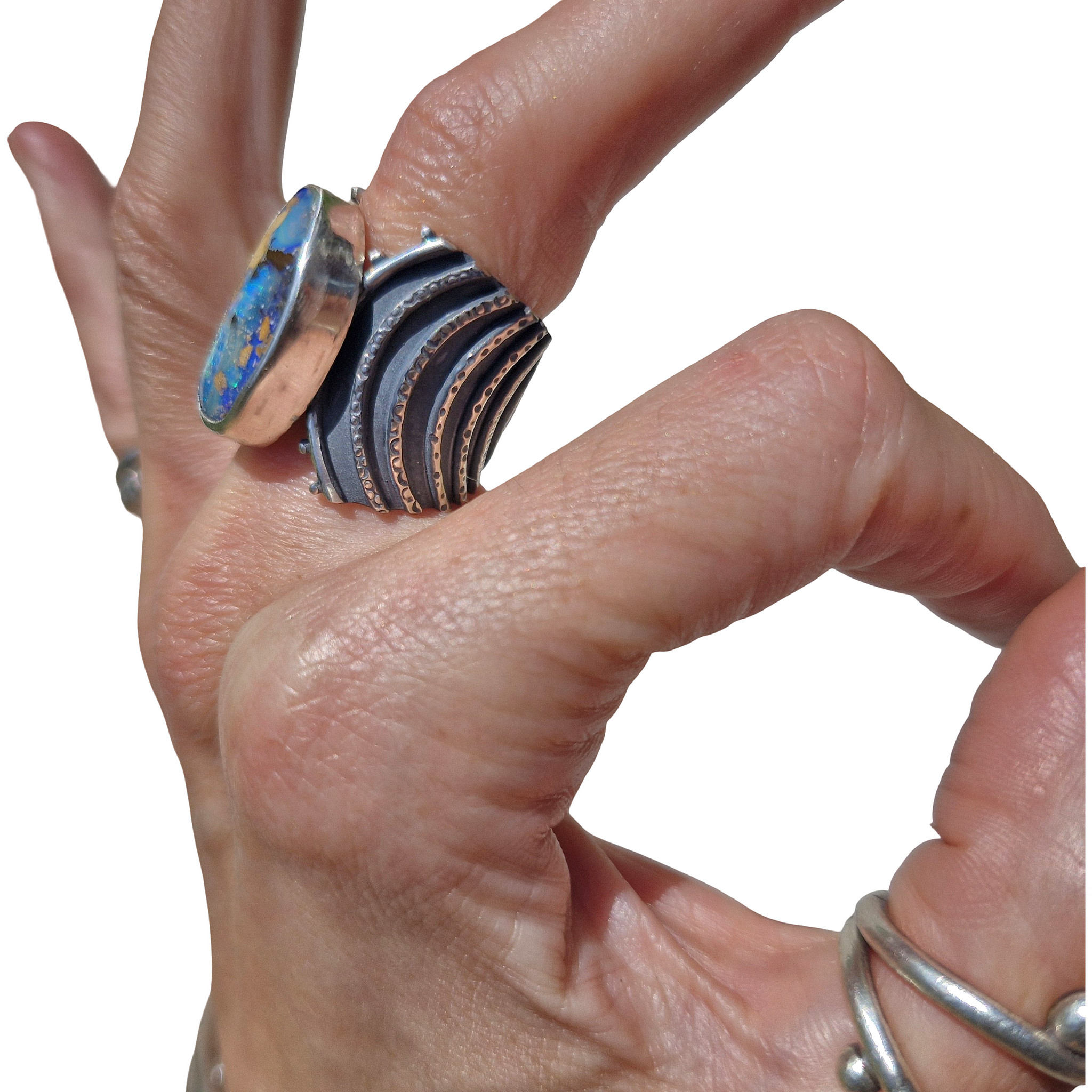 New Drop in the Ocean ring design ... with a centre 'drop', layered spirals rippling out with multi hand stamped textures. Finished with the brightest vivid blue green Boulder Opal... just like deep ocean waters.
