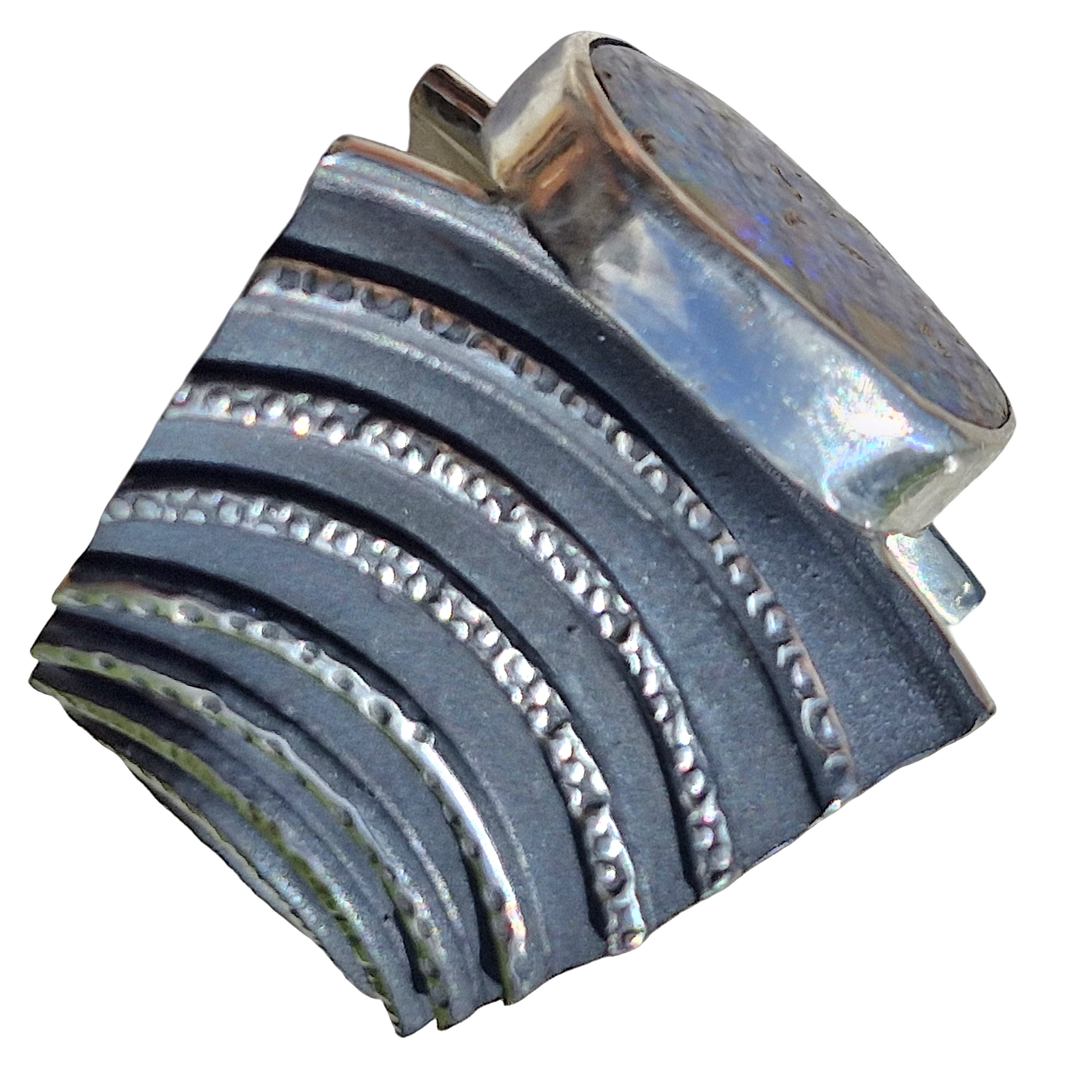 New Drop in the Ocean ring design ... with a centre 'drop', layered spirals rippling out with multi hand stamped textures. Finished with gorgeous pale lilac purpley Boulder Opal and lots of rainbow flashes.