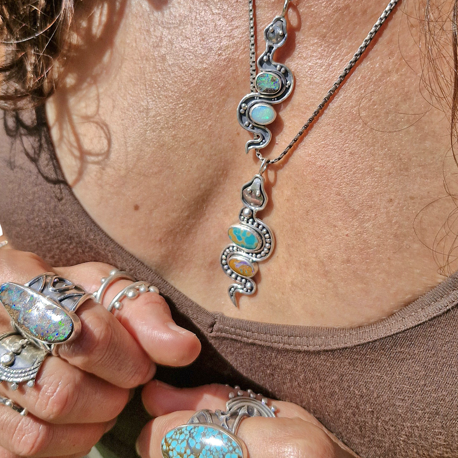 Dotty Serpent Pendant with snake wrapping around earthy Boulder and sparkly Mintable Opal. I love the organic flowing shape I managed to create with these pendants.