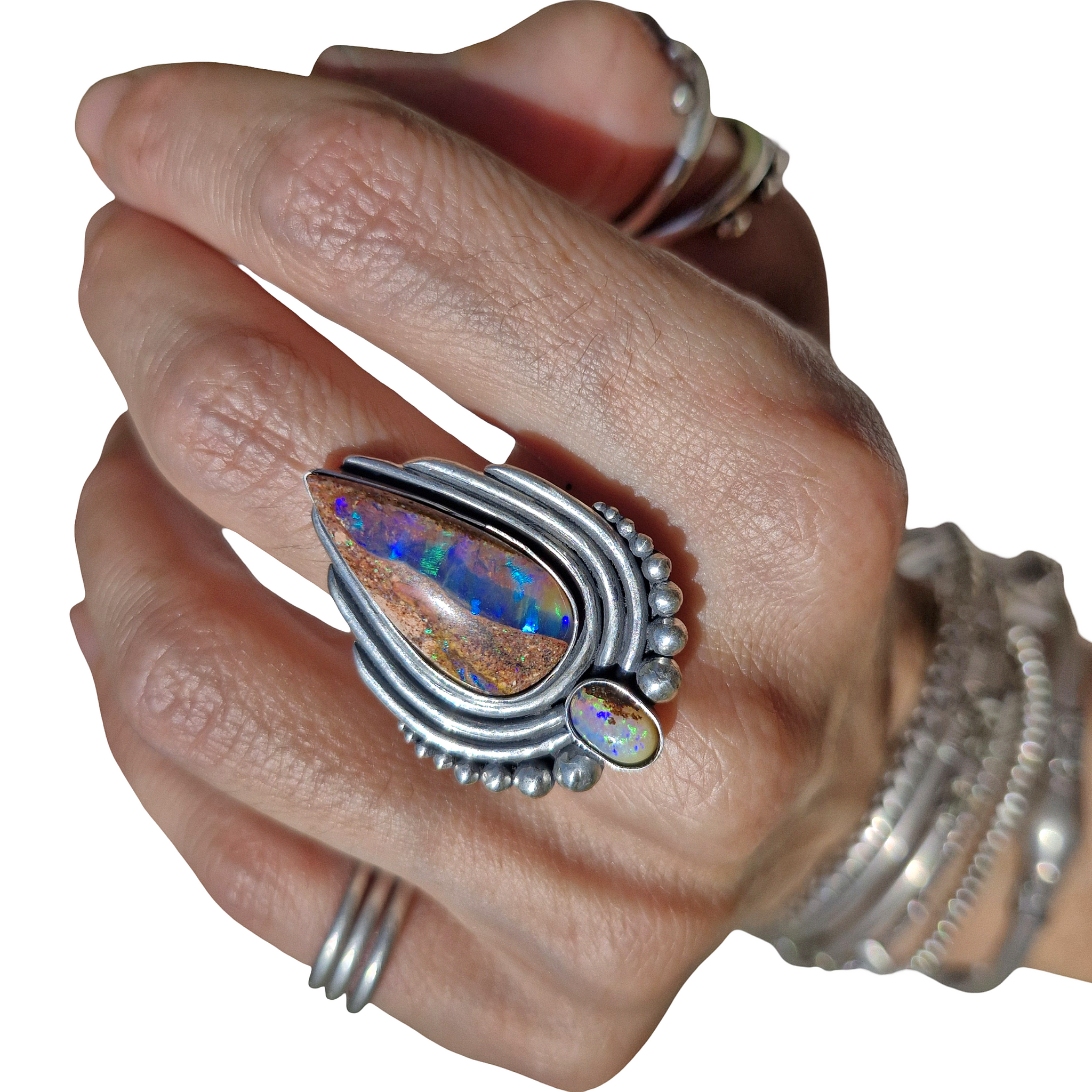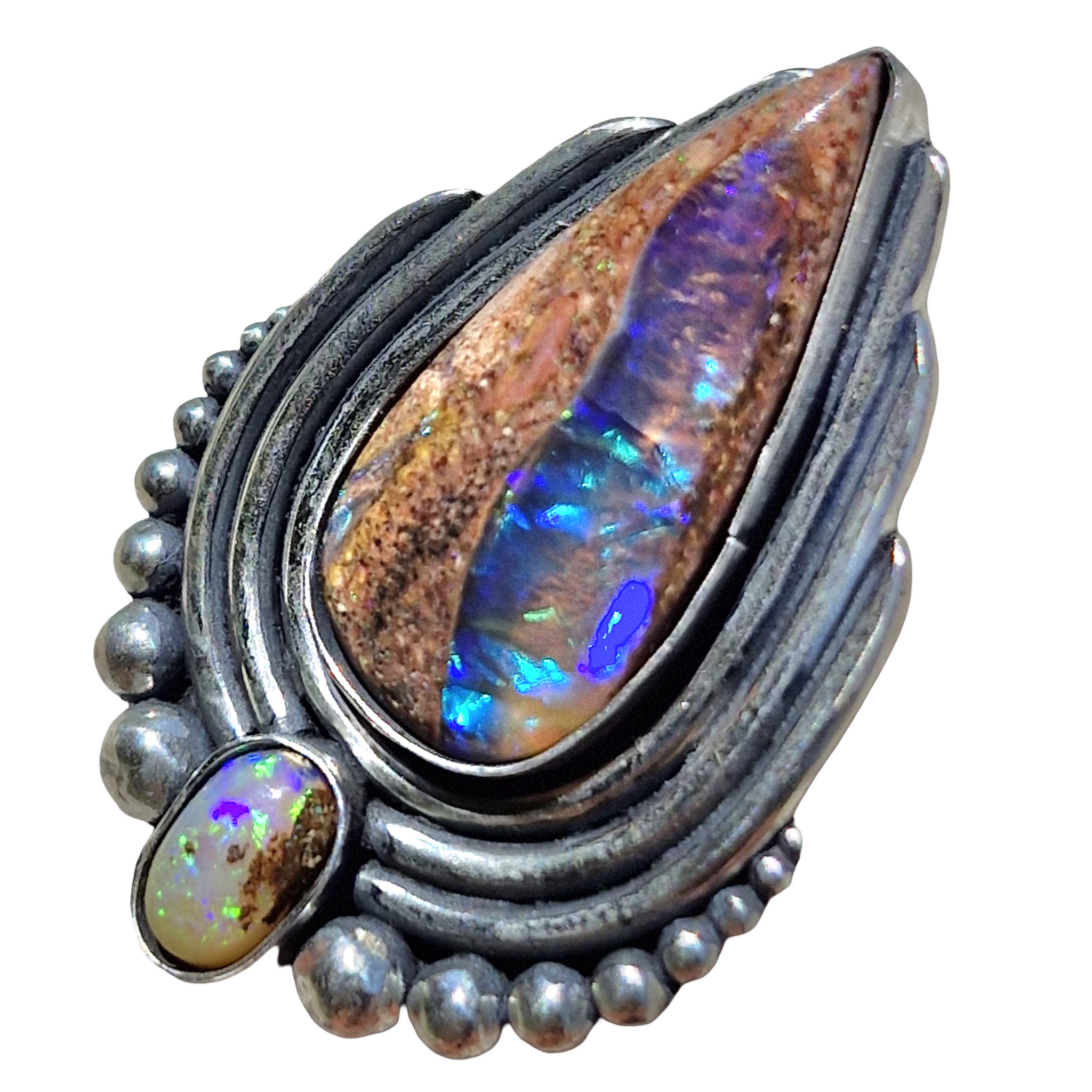 Beautiful Pipe Opal wuth its peachy tones and the most insane strike of electric blue turquoise flashes. Looks like a mini universe.. and paired with a mini Boder Opal, its small but packs a big flash too! Finished with multi smooth borders and dots.