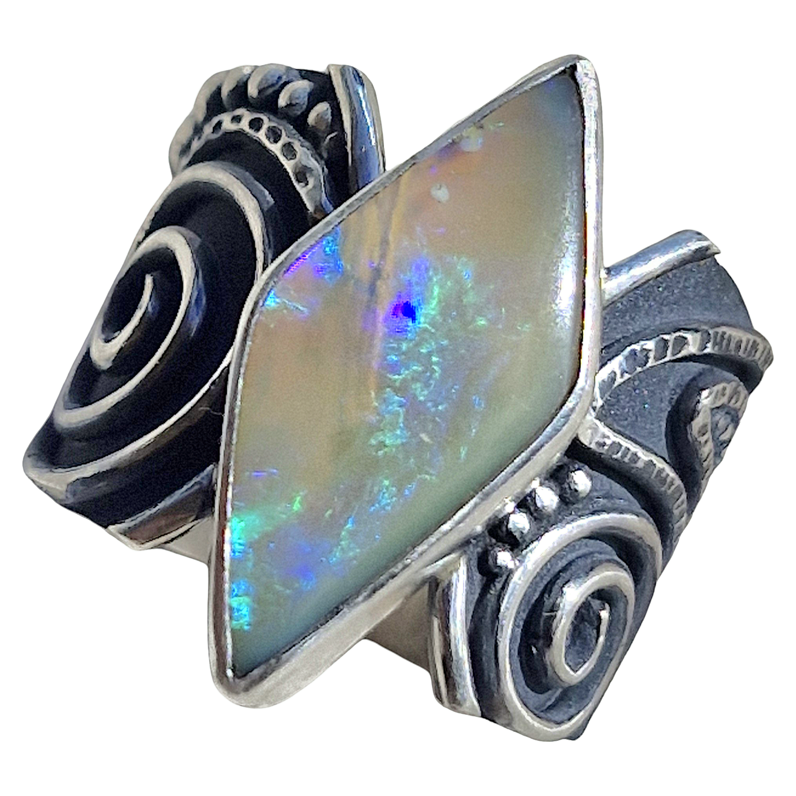 Finished with such a unqiue Bolder Opal... cut i. A diamond shape and with peachy pale almost see through base and the brightest blue green turquoise flashes.