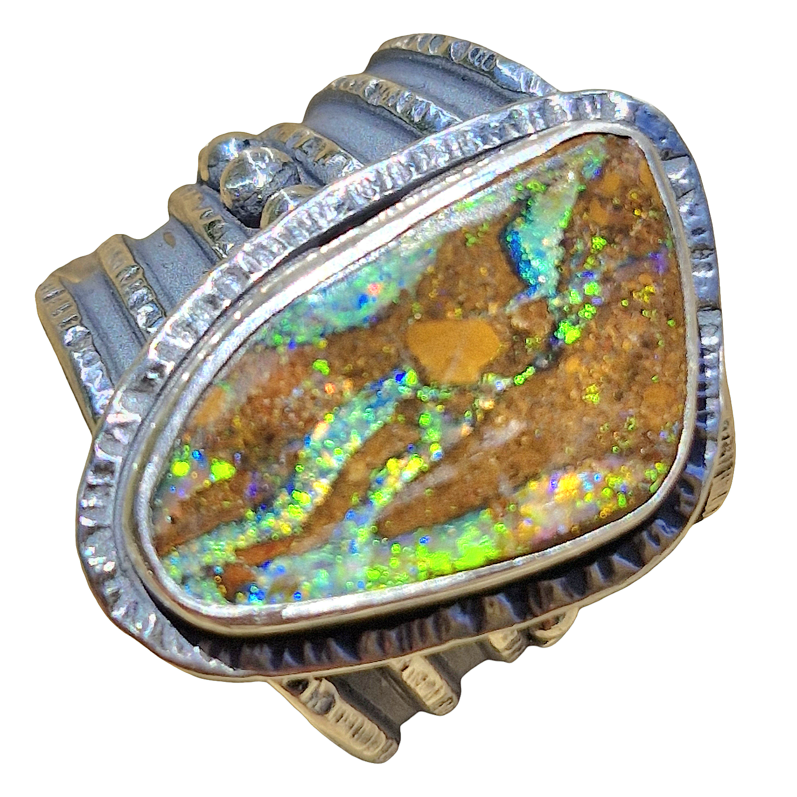 Such an insane Boulder Opal.. with its warm earthy tones and strikes of brightrst green yellow rainbow flashes. The patterns so remind me of tiger print ! Finished with my chunky earth layer band... with textured borders and dots.