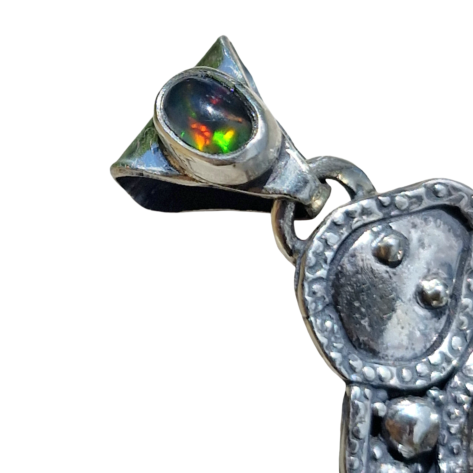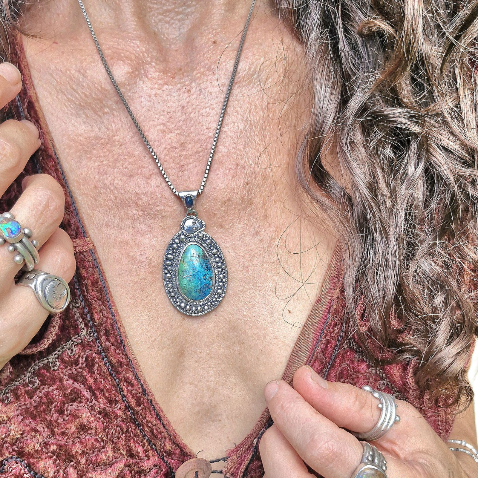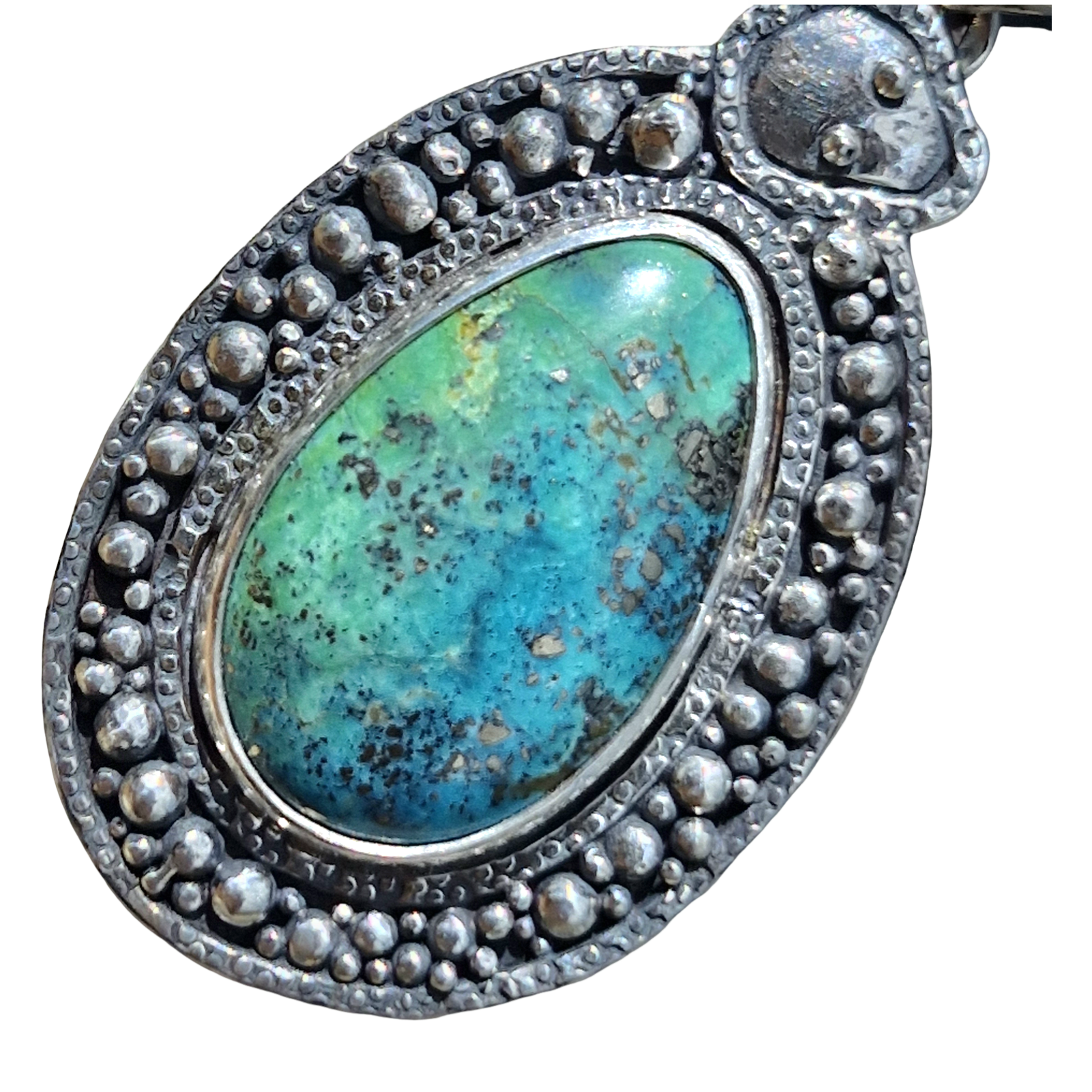 Dotty Serpent Pendant with snake wrapping around a gorgeous big Campitos Turquoise with a subtle ombre effect a flecks of silver pyrite with a Lightning Ridge Opal on the bale that has the classic dark stormy Lightnight Ridge base colour and bright rainbow flashes as it catches the light.