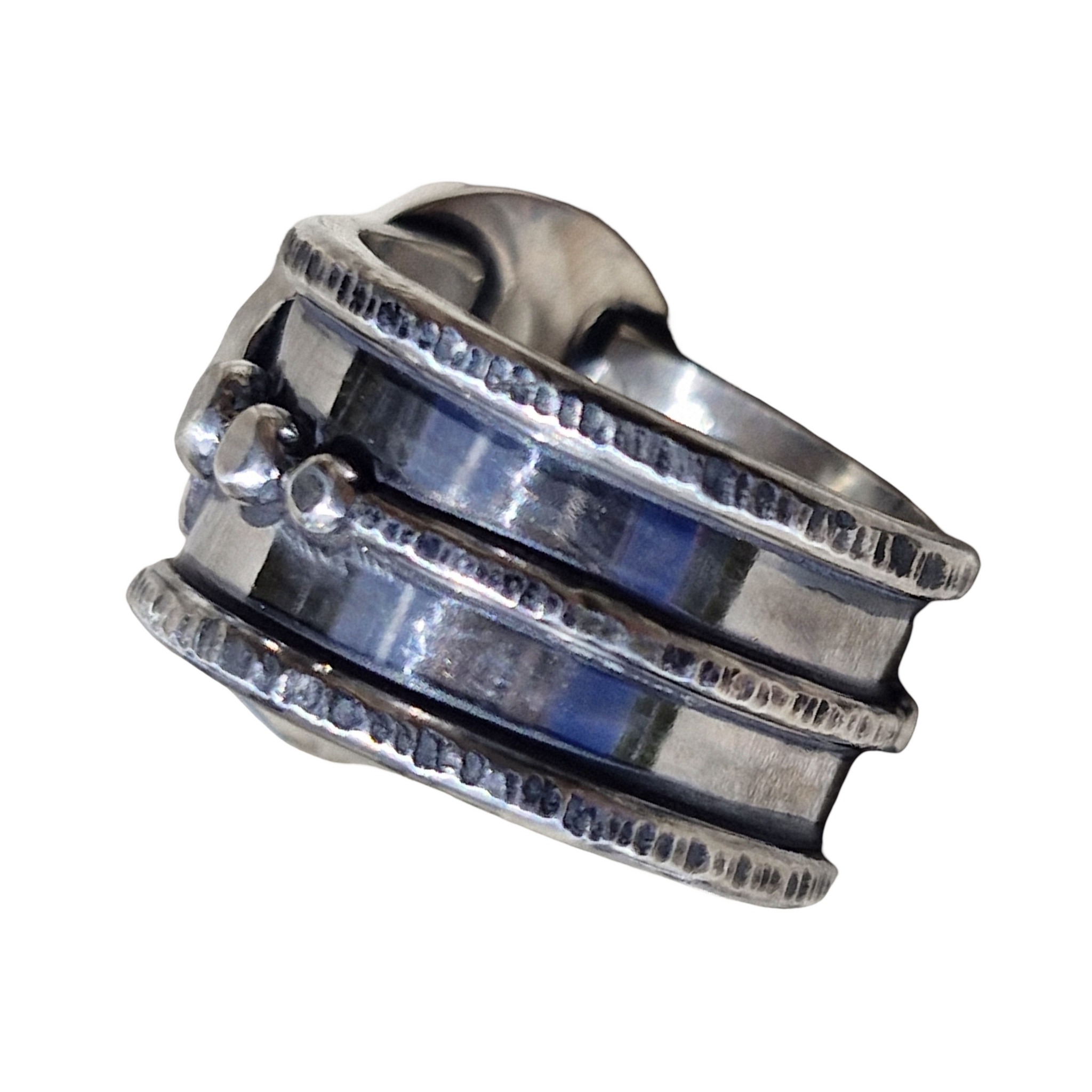 Size 9.75 but fits like a 9 please check measurements below. Ring band width 1.5cm and tapers to 1.2cm Inside diameter 1.94cm