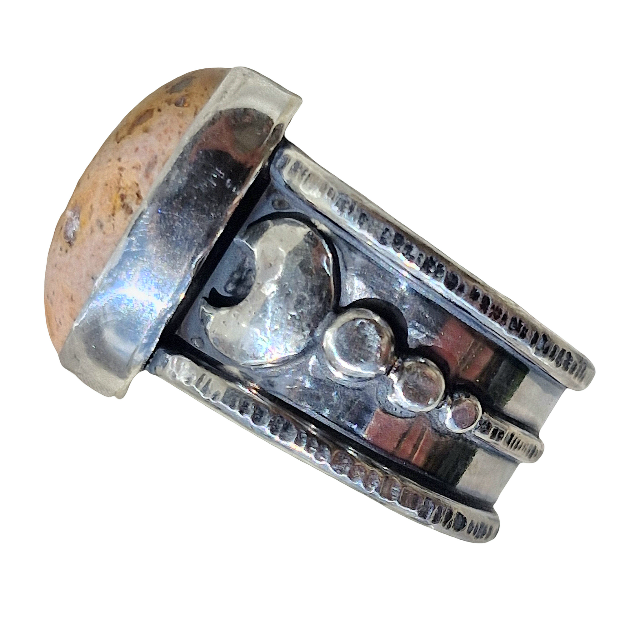 Gorgeous chunky Mexican Opal with classic peachy tones and rainbow flashy centre. Set on a chunky border band with crescent moons and chunky dots.
