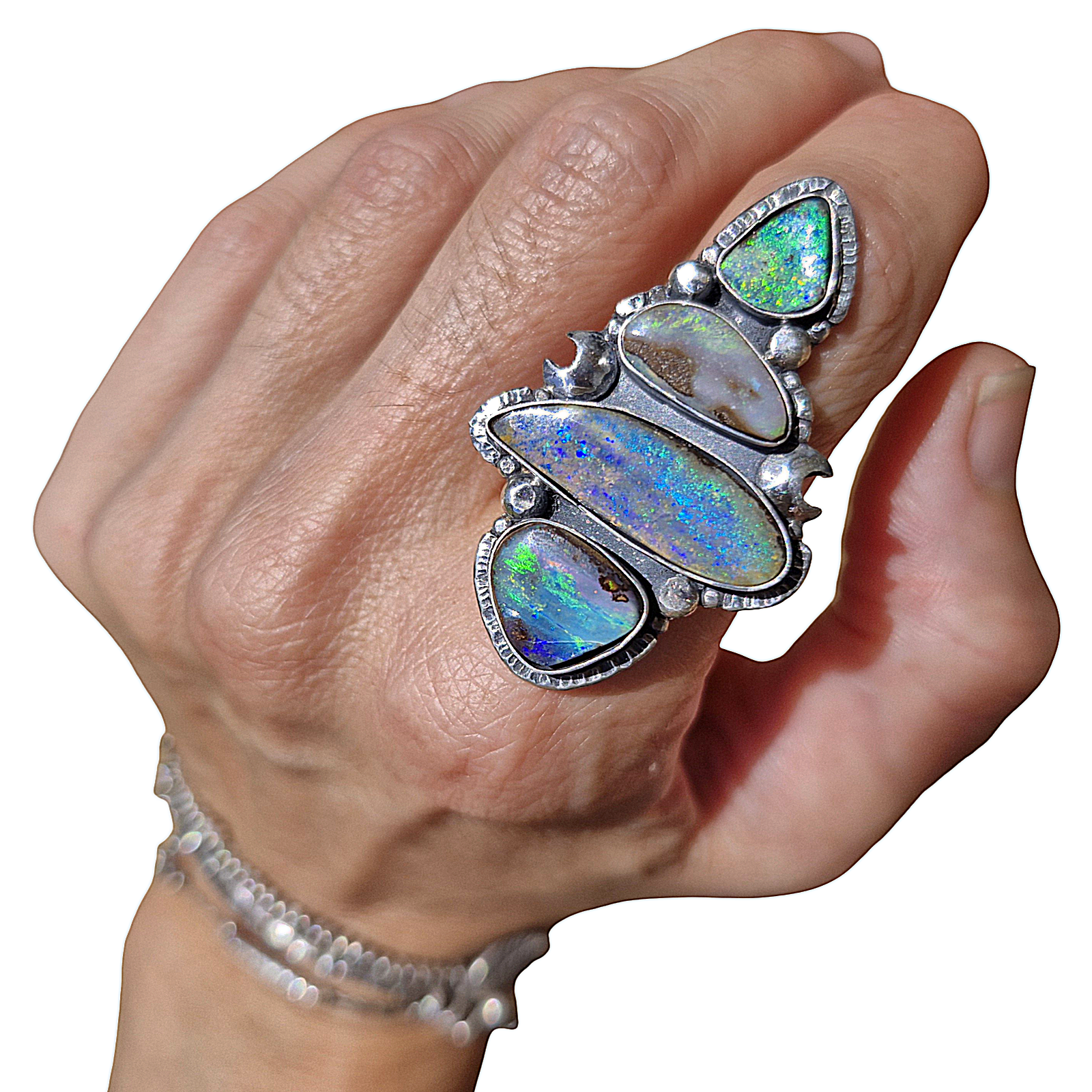 Magical mix of 4 Boulder Opals with so much flash. From the brightest turquoise blue rainbow sparkles to pretty lilacs with more pale purple rainbow flashes. And somehow their organic mis match shapes fit perfectly together.  Finished with dots and smooth borders.