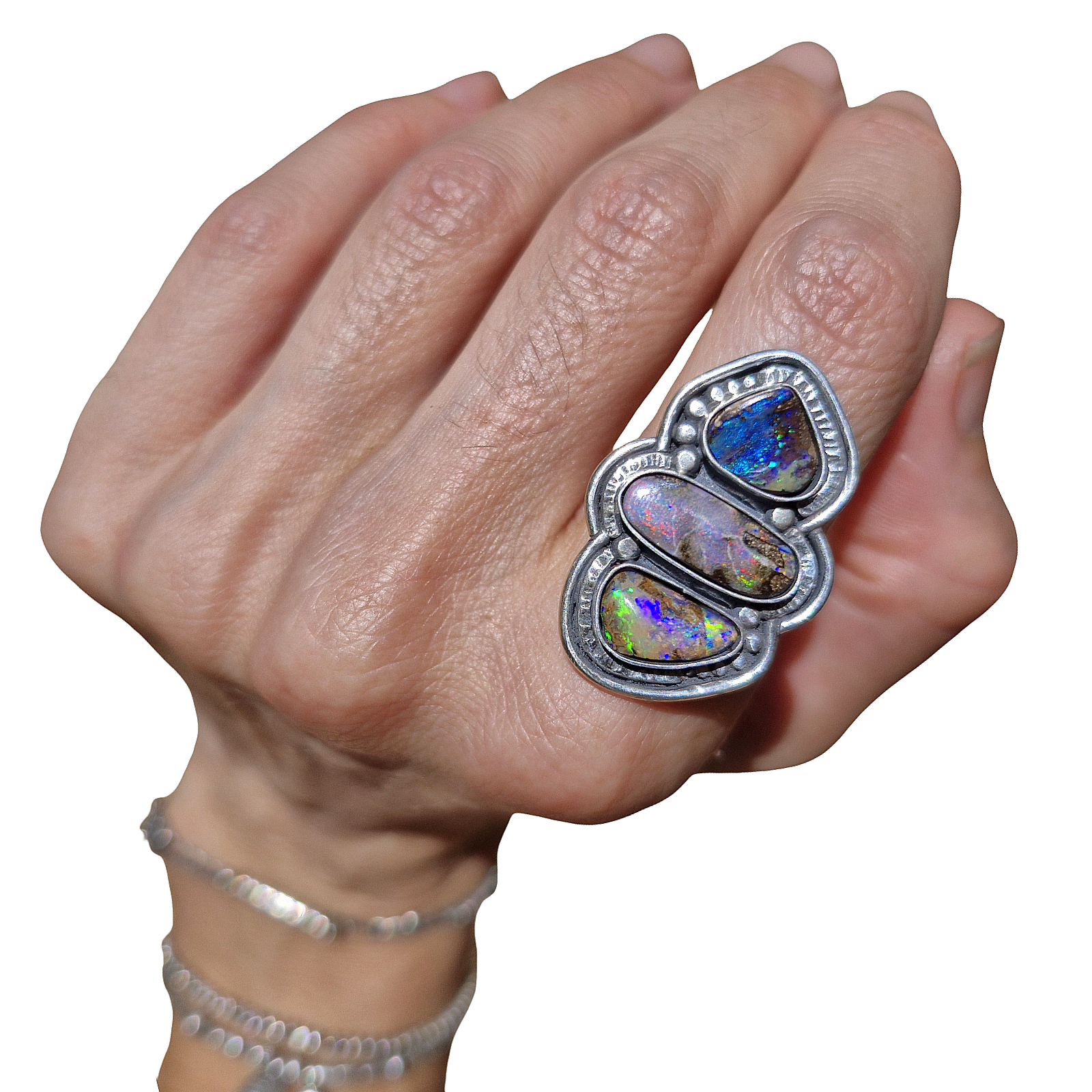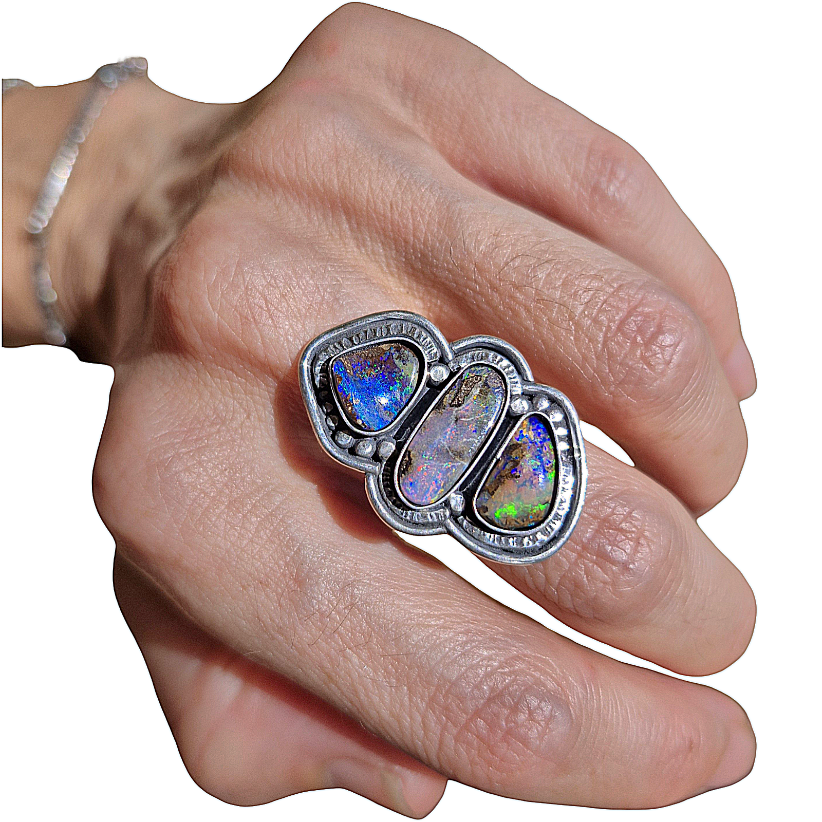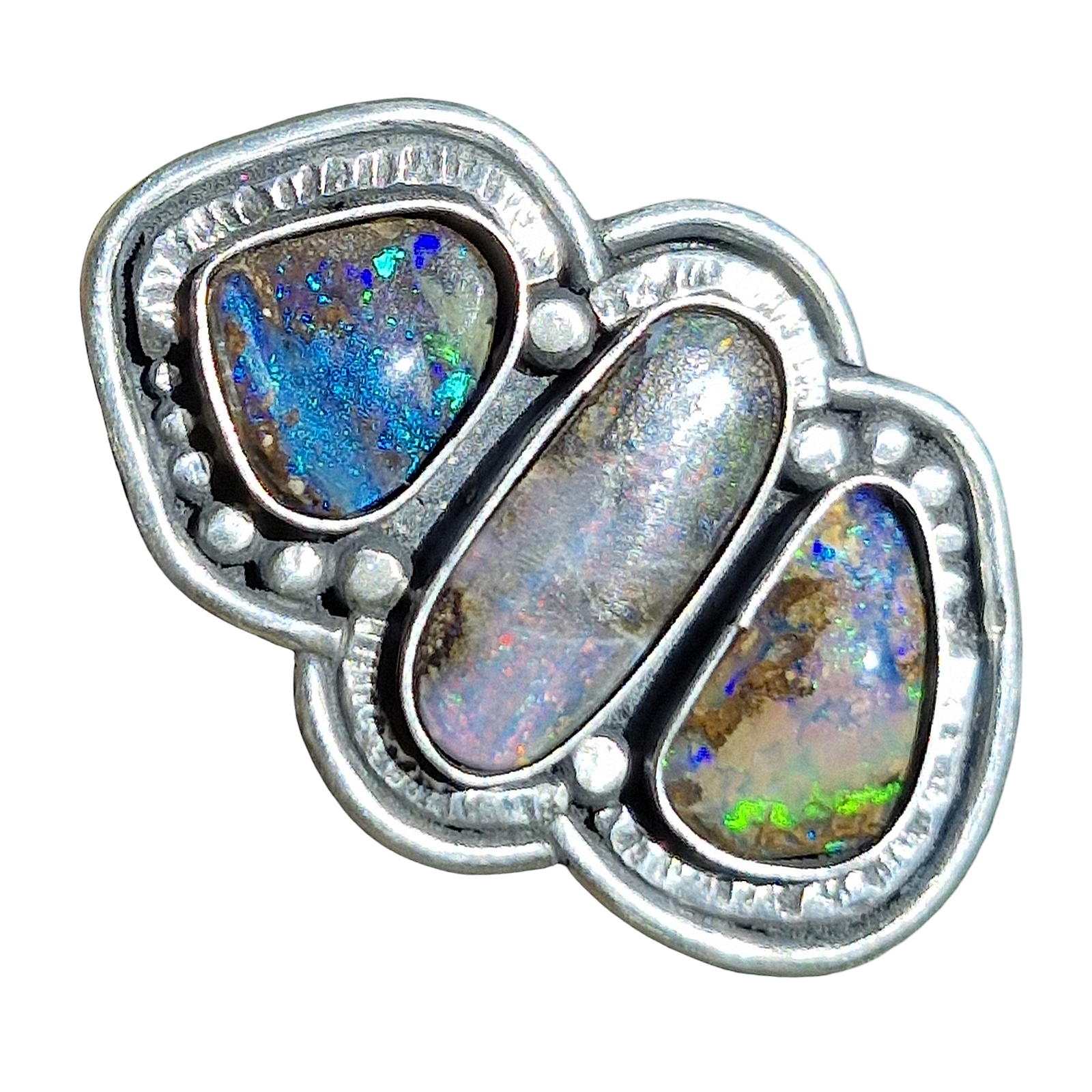 Beautiful trio of Boulder Opals, each with their own unique colours and flashes. From deep intense blue greeens, to the rare red sparkles over mauve and earthy tones with vivid green flashes and lilac hints. Finished with dots and smooth borders.